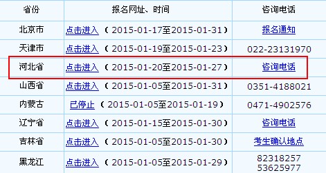 根据河北会计信息网公布《河北省关于2015年度全国会计专业技术初级资格考试有关事项的公告》获悉,河北2015年初级会计职称考试网上报名缴费时间为1月20日—1月27日。报名网站为“河北省会计信息网”,财政部“全国会计资格评价网”。考生可登录上述网站在网上填写报名信息、上传照片和网上交费。。