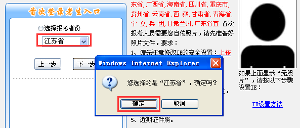 选择报名省份:注意需要自传照片的省份的考生先按页面提示把照片文件准备好,其他省份需到报名审核现场拍照上传,如图2.2: