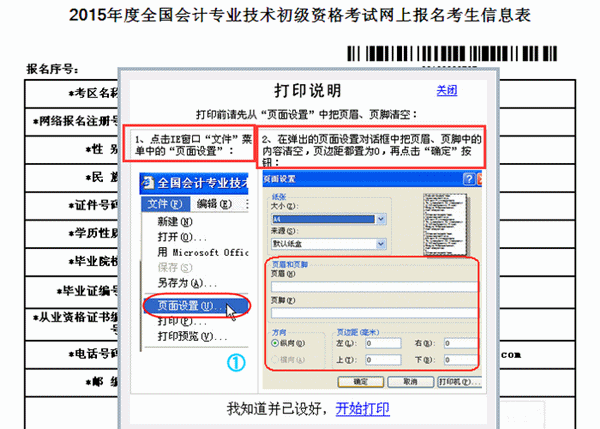 打印考生注册信息表:需要注意的是打印前要把页面设置中的页眉页脚清空,如下图2.11所示: