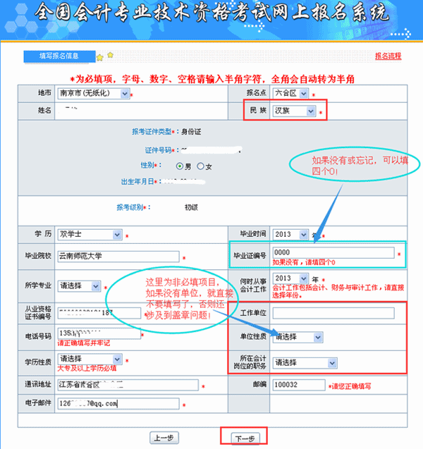 点“确定”按钮,进入“填写报名信息”页面(如图2.7),点“取消”则返回修改。