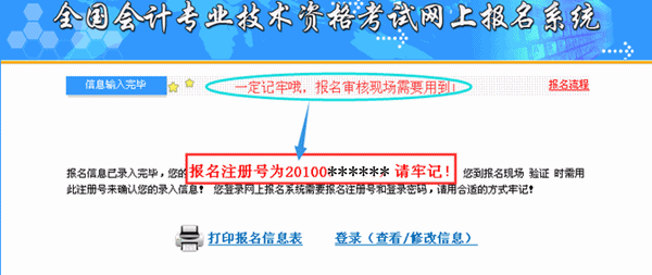 注册完毕之后,系统会给出您的报名注册号,请牢记,如图2.9