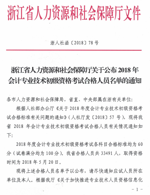 浙江省人力资源和社会保障厅关于公布2018年会计专业技术初级资格考试合格人员名单的通知