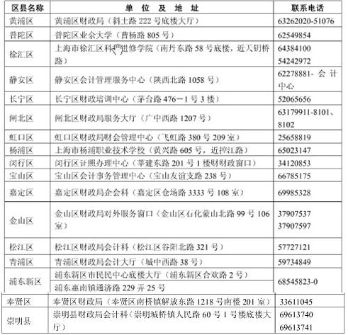 (一)领取初级资格证书确认所属区县财政局,请查询成绩单上的发证编号,如1310-0451-2-00427,代码为:0451徐汇区、0551长宁区、0651静安区、0751普陀区、0851闸北区、0951虹口区、1051杨浦区、1251闵行区、1351宝山区、1451浦东新区(不含惠南)、1951黄浦区、2251嘉定区、2551浦东新区(惠南)、2651奉贤区、2751松江区、2851金山区、2951青浦区、3051崇明县。