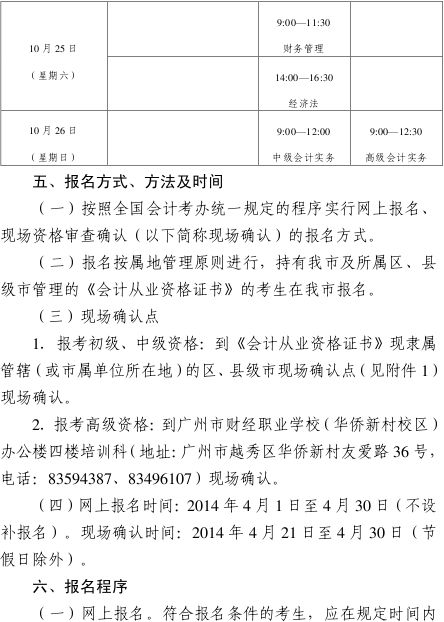 广东广州2014年初级会计职称考试报名时间2014年4月1日至4月30日(不设补报名)。现场确认时间:2014年4月21日至4月30日(节假日除外)。持会计从业资格证到现场确认点审核确认!