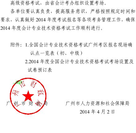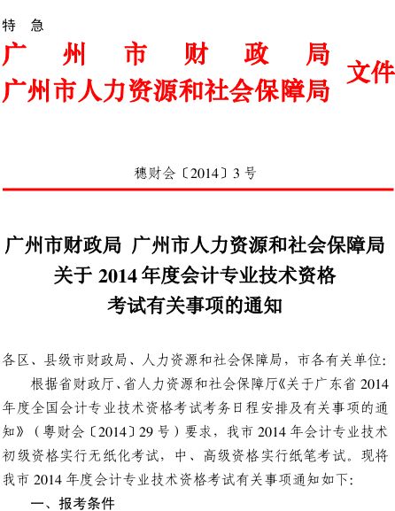广州市财政局 广州市人力资源和社会保障局关于2014年度会计专业技术资格考试有关事项的通知(穗财会[2014]3号)