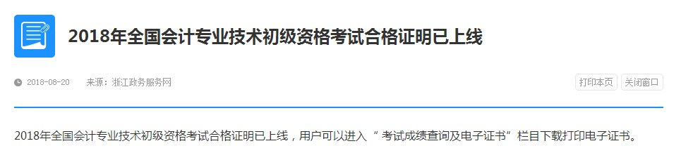 重要通知!浙江省2018年初级会计职称考生注意啦,浙江政务服务网近日公布:2018年全国会计专业技术初级资格考试合格证明已上线,用户可以进入“ 考试成绩查询及电子证书”栏目下载打印电子证书。