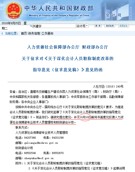 财政部会计司要求各省、自治区、直辖市及新疆生产建设兵团人力资源社会保障厅(局)、财政厅(局),中央和国家机关各部委、各直属机构人事部门,中央军委政治工作部干部局、后勤保障部财务局,各中央企业人事部门就该意见稿提出意见,并于10月10日前进行书面反馈。
