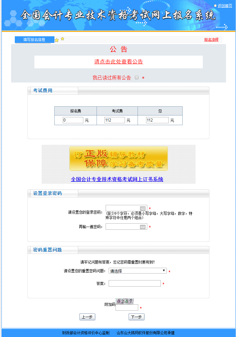 5、最后设置登录密码和密码重置问题,当忘记报名注册号时,可凭此信息找回。然后确认已读过所有公告;