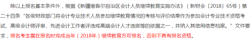 但是从各地官方公布的报名政策来说,还有更为具体的报名条件,比如新疆要求报考2019年会计初级考试的考生完成当年(2018年)继续教育(90学时),否则不具有报名资格。