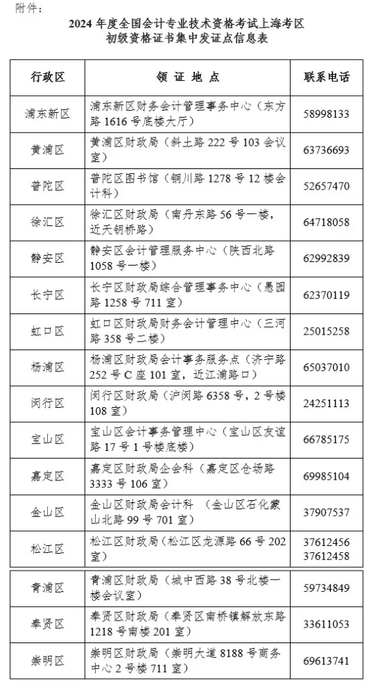 附件:2024年度全国会计专业技术资格考试上海考区初级资格证书发证点信息表