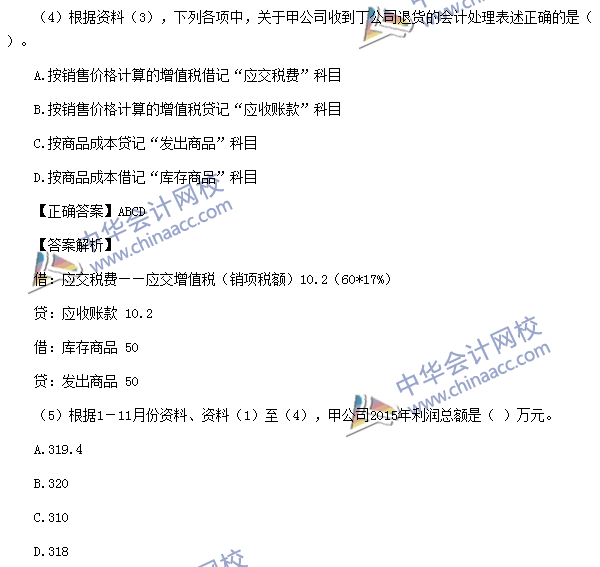 (4)【点评】该题考核销售退回的相关核算。该知识点与考前模拟试题(一)单选第13题、