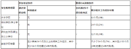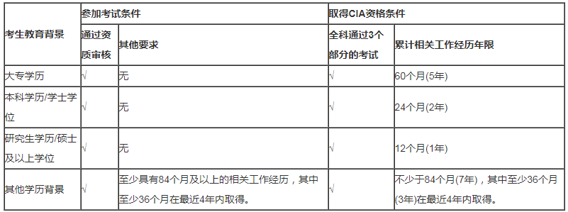 为了鼓励广大内部审计人员通过取得CIA资格提升职业能力,根据IIA在全球范围内的统一要求,原则上只要具有大专及以上教育背景(如不能满足教育背景的要求,则需要满足一定内部审计相关工作年限的要求,包括内部审计、风险管理、内部控制、与内审相关的咨询和评价服务、国家审计、社会审计等,下同),并通过资质审核,均可参加cia考试,同时强调了实务经验的重要性,将内部审计相关工作经历纳入认证流程,作为取得CIA资格的必要条件,具体年限要求由考生的学历/学位决定,详情见下图: