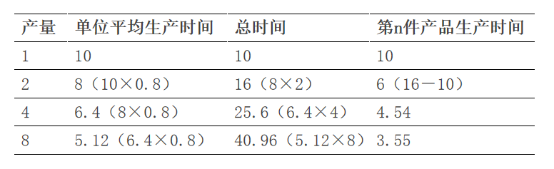 产量每翻一倍,通过学习率计算得到的是翻倍后单位产品的平均生产时间。