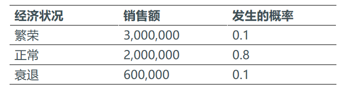 销售额期望值=3,000,000×0.1+2,000,000×0.8+600,000×0.1