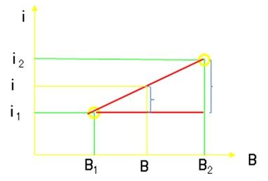 =B1+(I1-I)/(I1-I2)×(B2-B1)
