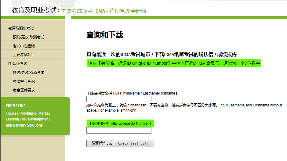 准备参加2017年7月29日CMA中文考试的考生,现可在普尔文Prometric考试中心网站上使用姓名拼音全拼和IMA用户编号(为7位数字),来确认考位是否预约成功和预约的城市。正式准考信将于考试日前10天左右开始下载。