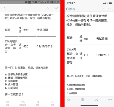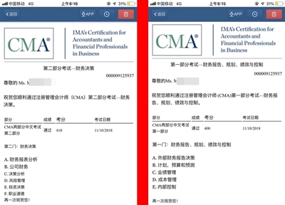 今日(12月20日)凌晨,美国管理会计师协会(IMA)公布了11月CMA中文考试的成绩,正保会计网校众多CMA学员纷纷在朋友圈晒出了自己的成绩。班主任老师通过微信、QQ频频收到学员们通过的捷报,从目前的形势来看,网校今年通过率以及通过分数将有望突破新高!