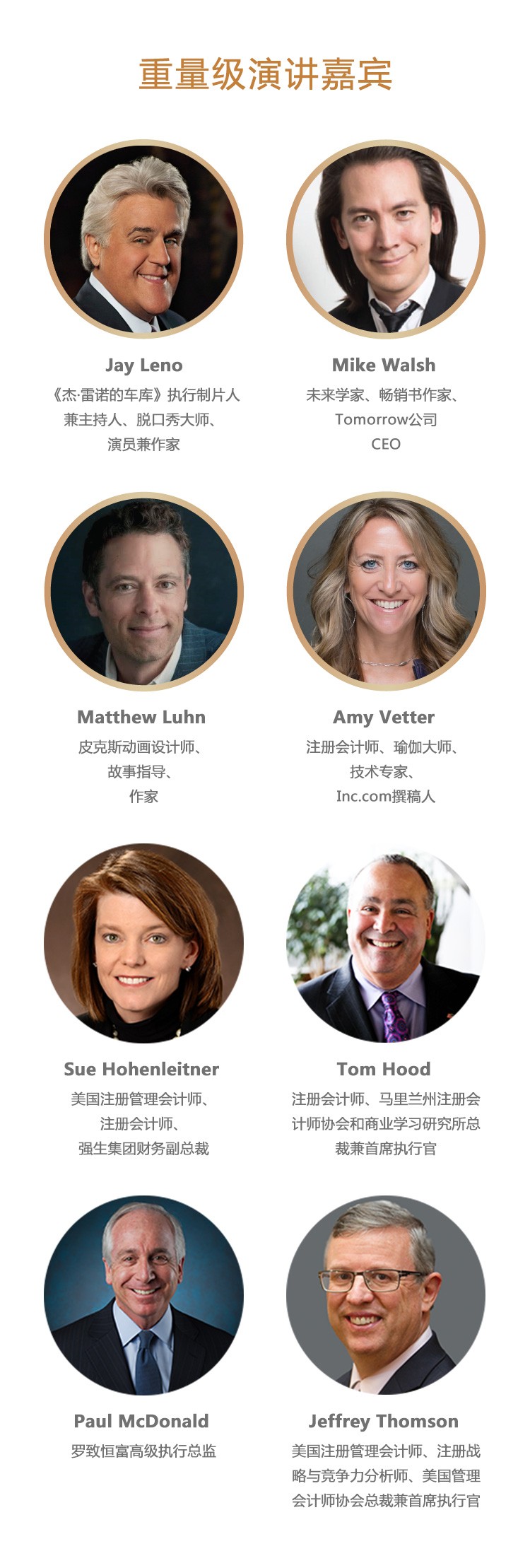 本次年会开场秀将邀请《杰·雷诺的车库》执行制片人兼主持人、脱口秀大师、演员兼作家——杰·雷诺(Jay Leno)担任开场嘉宾,同时他也是本次年会的主旨演讲嘉宾之一。主旨演讲嘉宾与圆桌论坛嘉宾包括: