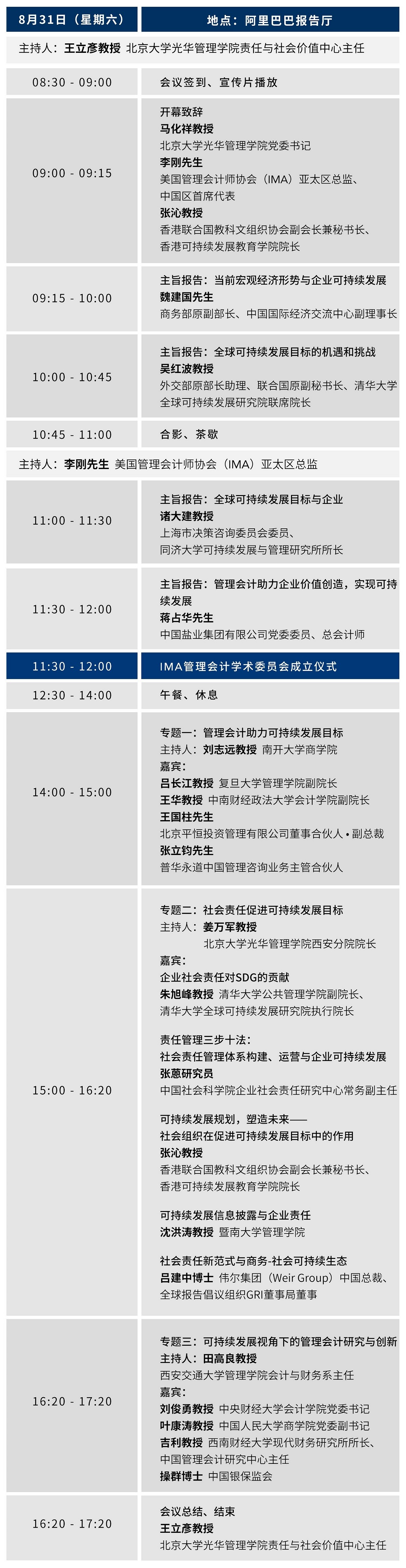 管理会计作为企业发展过程中的量化管理工具,在计量、分析、评估、报告和管理可持续发展绩效过程中具有重要的支撑作用。为探索运用管理会计的工具和方法洞见可持续发展目标(SDGs)带来的商业机会,助力企业共创价值并促进落实联合国2030可持续发展议程,美国管理会计师协会(IMA)携手北京大学责任与社会价值中心、香港可持续发展教育学院,定于2019年8月31日(星期六)联合举办“管理会计助推联合国2030可持续发展议程:价值洞见与责任担当”高端论坛,具体安排如下: