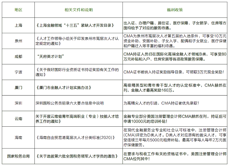 CMA证书福利政策地区汇总