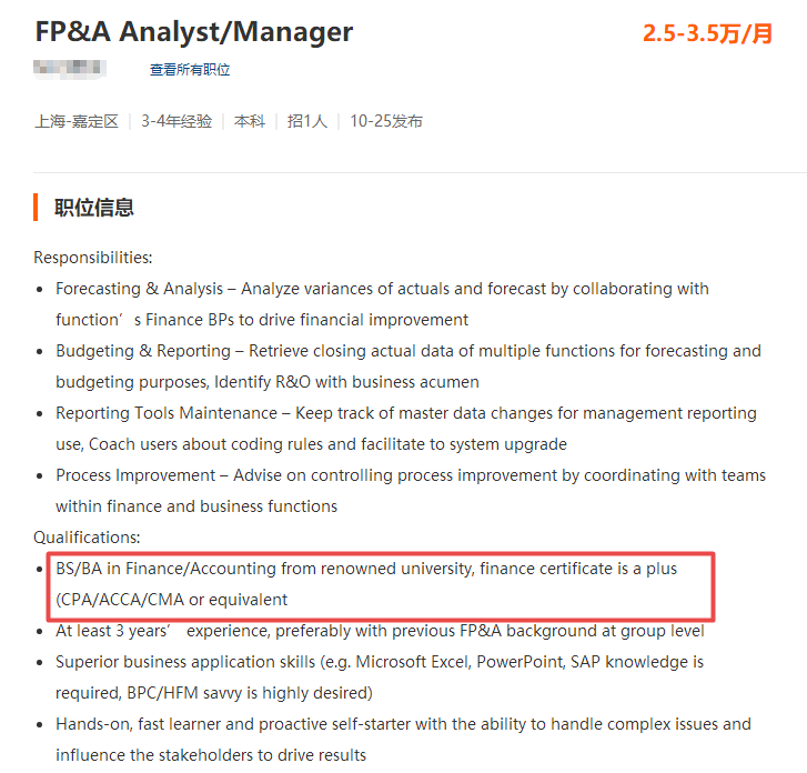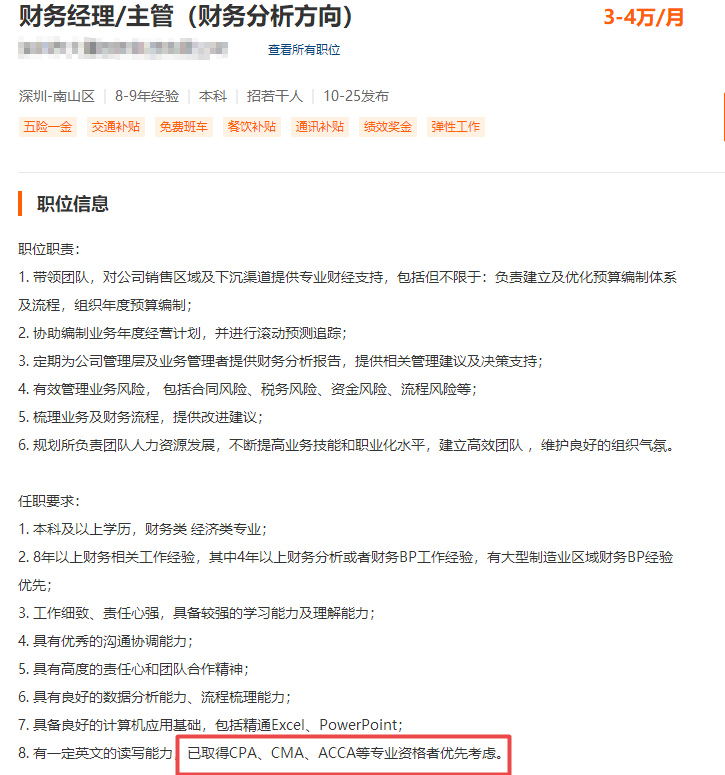 小编从招聘网站截取的一些企业的招聘信息,拥有CMA证书可都是竞争财务总监、财务经理的加分项噢!
