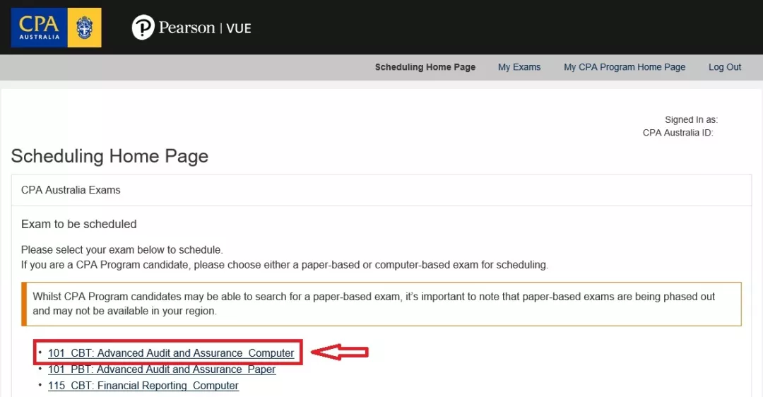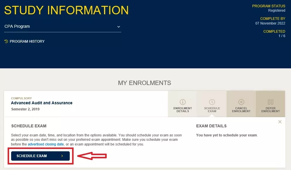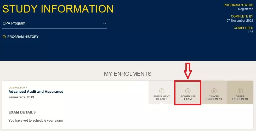 返回STUDY INFORMATION页面。如果您已经成功报名考试,页面上将显示您的考试科目,选择该科目右上方菜单栏中的SCHEDULE EXAM栏目。