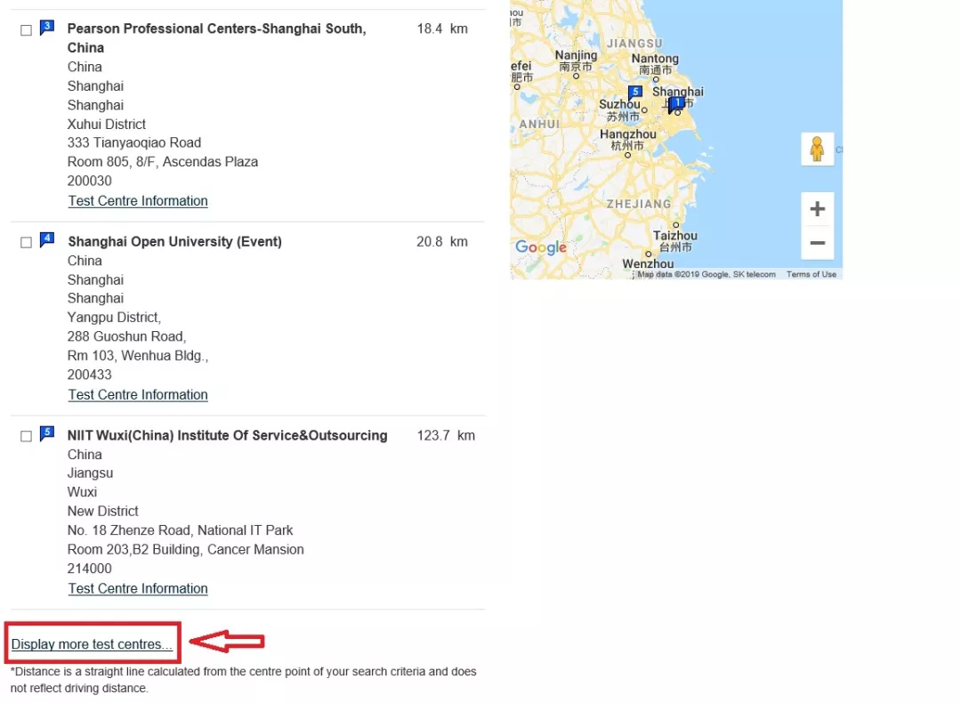 系统会显示距离这个城市至近的5个考点,如果您想查看更多考点,请点击Display more test centres。
