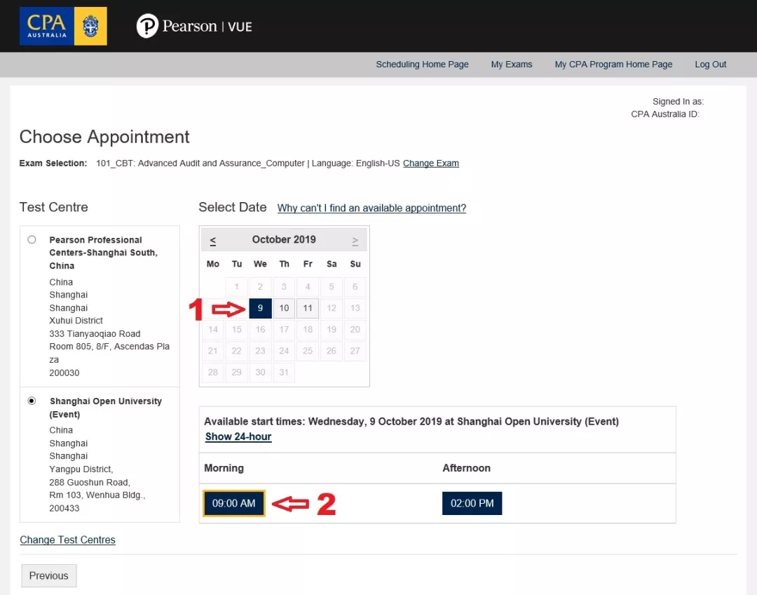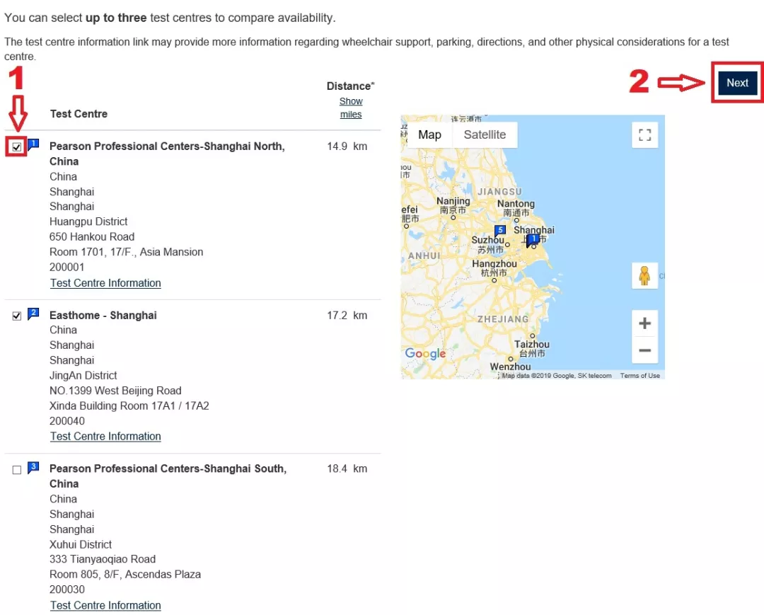 选择您希望参与考试的考点后点击Next,查看该考点可以提供考试的日期及时间(至多可同时查看三个考点)。