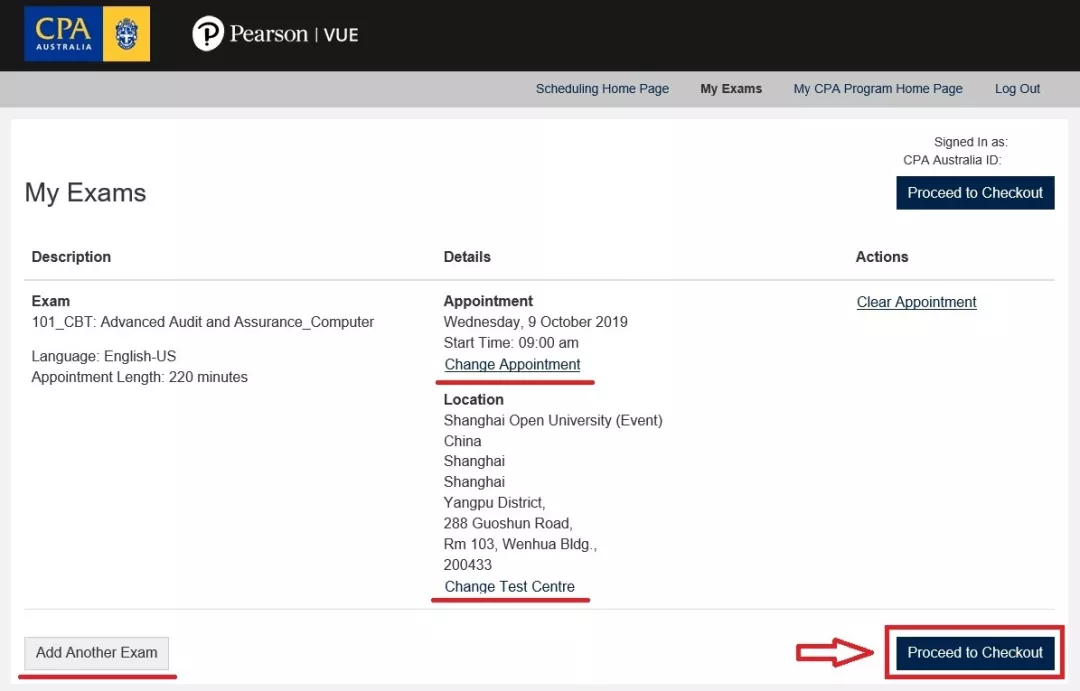 如需修改日期和场次请点击Change Appointment;如需修改考点,请点击Change Test Centre;如需同时注册其它已报名科目的考点,请点击Add Another Exam。