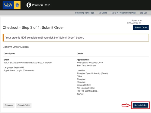 倒计时,请确认考点注册信息,点击Submit Order。成功注册后,您将收到确认邮件。