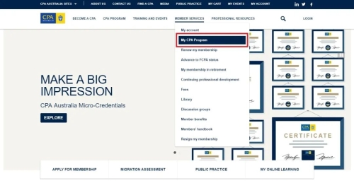 01打开澳洲会计师公会官方网站(www.cpaaustralia.com.au),并在MEMBER SERVICES的下拉菜单中,点击My CPA Program进入相应页面(或点击文末“阅读原文”)。