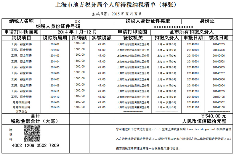 附件:《上海市地方税务局个人所得税纳税清单》样张