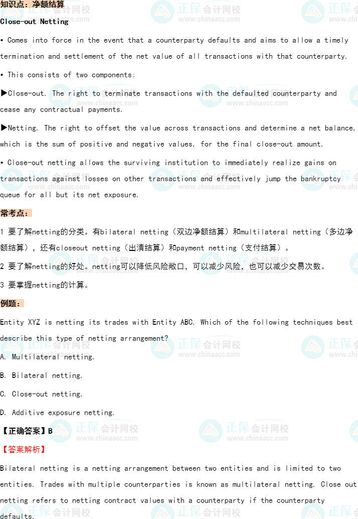 不过不用担心,信用风险计量与管理部分的重点知识,正保会计网校的老师已经给大家整理出来啦!搭配例题解析,能帮助大家更好的理解和掌握知识点!今天来学习信用风险计量与管理中的净额结算吧!
