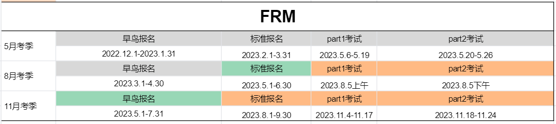 需要提醒大家的是:目前2023年frm考试报名窗口只剩8月考季和11月考季,8月考季正在标准报名阶段,报名时间为:2023年5月1日-6月30日,11月早鸟报名时间为:2023年5月1日-7月31日,标准报名时间为2023年8月1日-9月30日。打算在2023年参加考试的同学请尽快完成报名!
