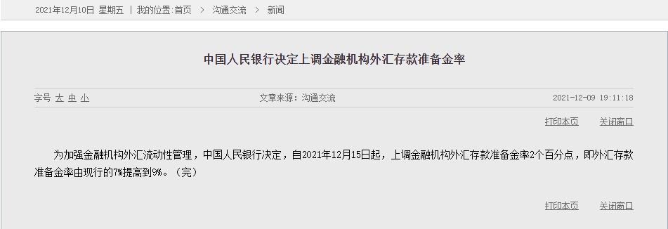 为加强金融机构外汇流动性管理,中国人民银行决定,自2021年12月15日起,上调金融机构外汇存款准备金率2个百分点,即外汇存款准备金率由现行的7%提高到9%。