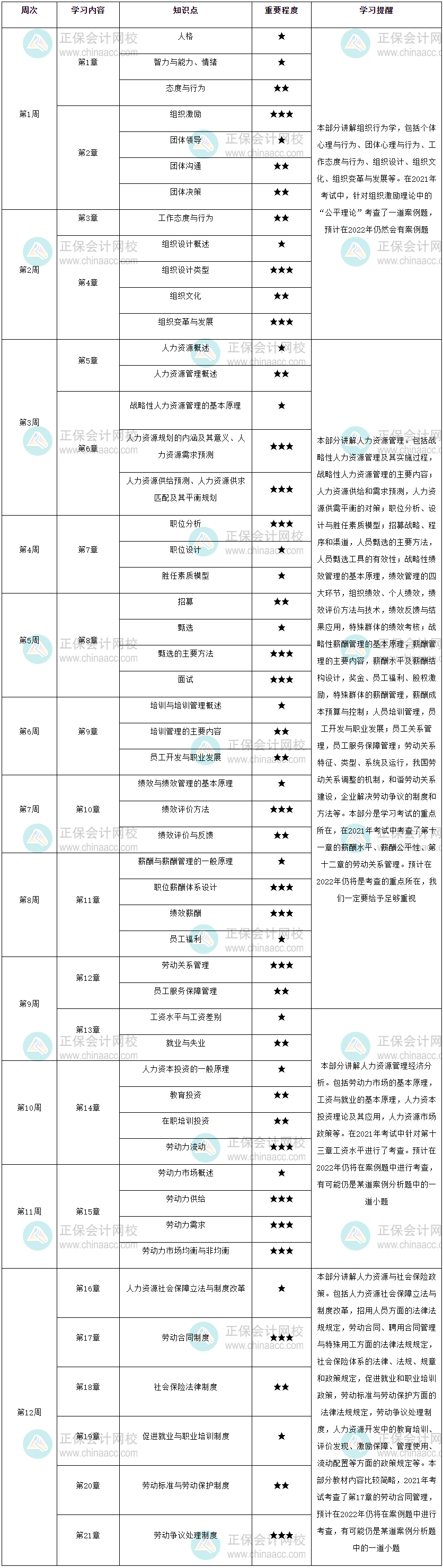 2022年高级经济师《人力资源管理》12周预习计划