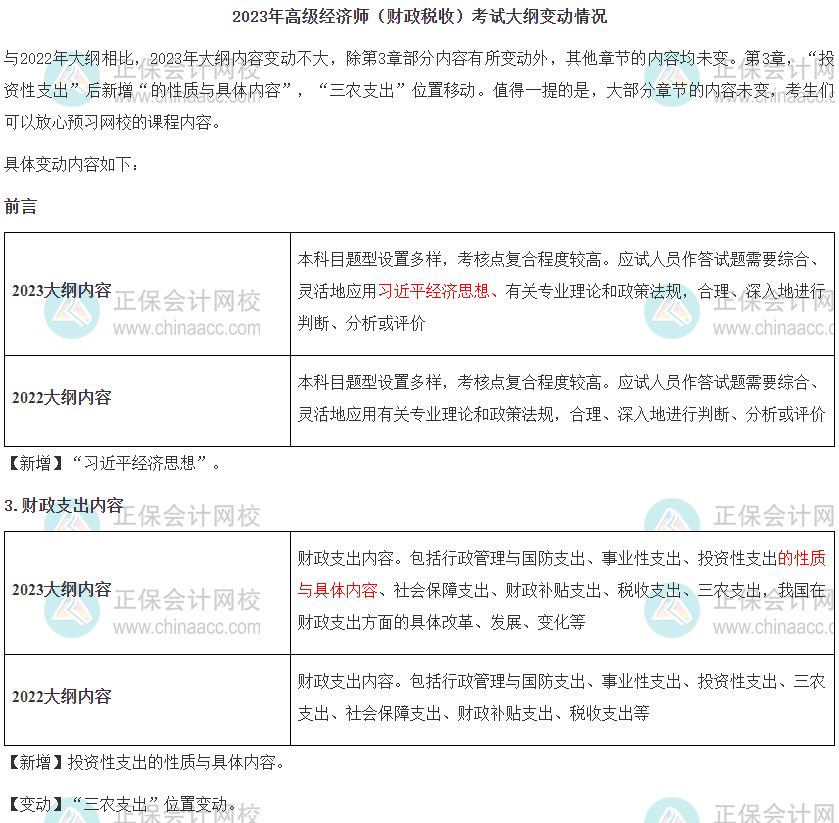2023年高级经济师《财政税收》考试大纲已公布,点击查看>> 考试大纲变化大吗?网校教务老师特对2023年与2022年高级经济师考试大纲进行了对比,与2022年大纲相比,2023年大纲内容变动不大,除第3章部分内容有所变动外,其他章节的内容均未变。