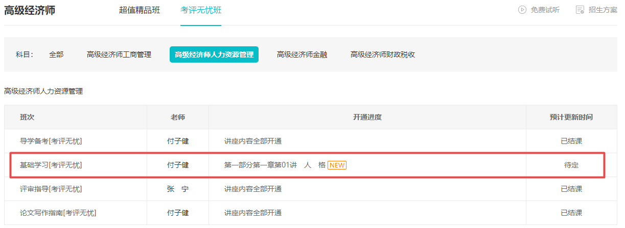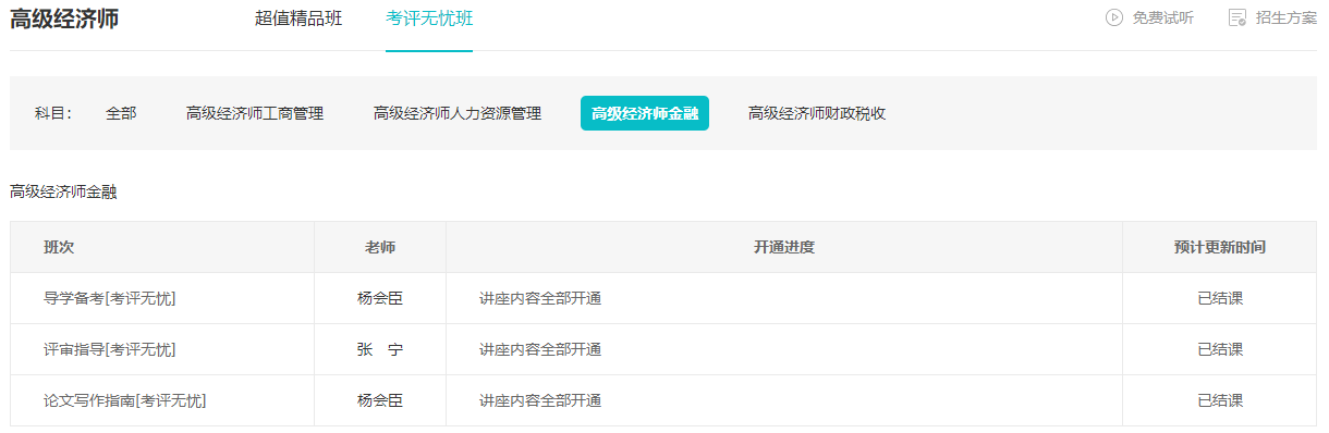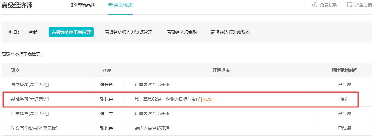 下面以高级经济师考评无忧班为例,来看看网校高级经济师各科目开课进度情况吧!