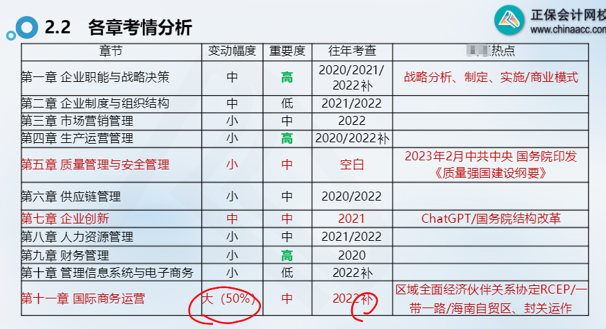 划重点:在考情分析处,张长鲁老师特将各章变动幅度、重要程度、往年考核情况及对应的热点联系都做了标记,一图即可看出哪些需要重点备考,哪些需要看什么热点。