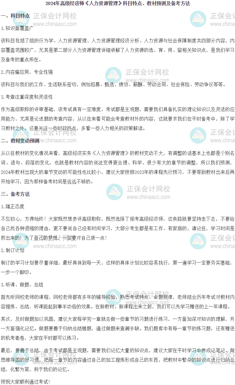 你知道高级经济师人力资源管理专业有什么特点吗?想要提前学习,又怕教材变化太大,怎么办?来看网校教务老师为大家准备的“2024年高级经济师《人力资源》科目特点、教材预测及备考方法”吧!提前预习不踩坑!