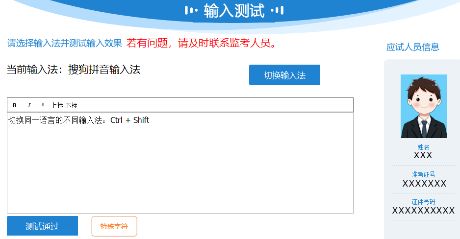 应试人员可在作答区域下方点击“切换输入法”按钮,切换不同的输入法。