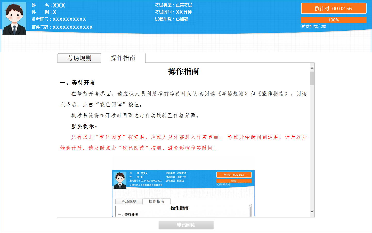在等待开考界面,请应试人员利用考前等待时间认真阅读《考场规则》和《操作指南》。阅读完毕后,点击“我已阅读”按钮。