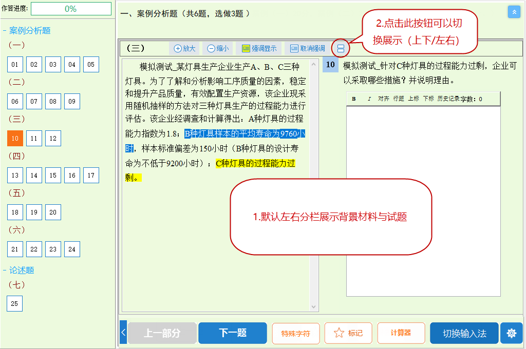 试题栏默认左右分栏展示案例背景与试题,点击切换按钮可以切换为上下分栏显示。