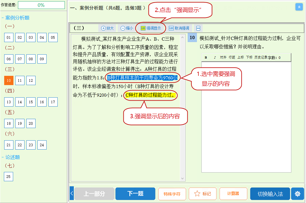 应试人员可以根据需要对试题文字进行强调显示或者取消强调显示。选中对应文字后点击“强调显示”按钮,可将文字标记为黄色。