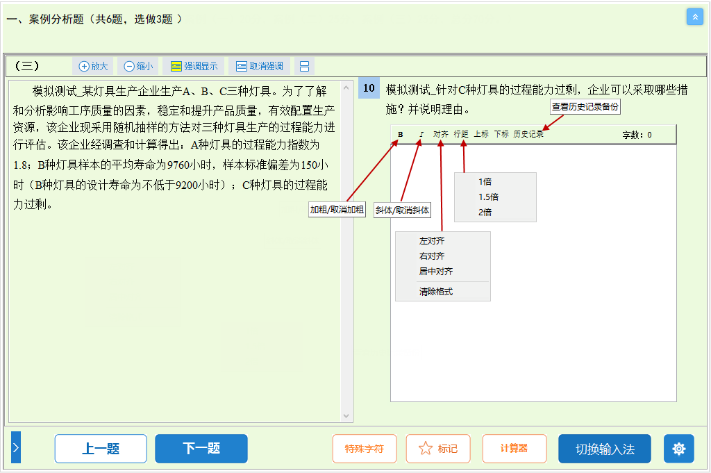 应试人员可点击作答区域上方按钮对作答内容进行加粗、倾斜、更改对齐方式、调整行距、上标/下标、查看及恢复历史记录备份。