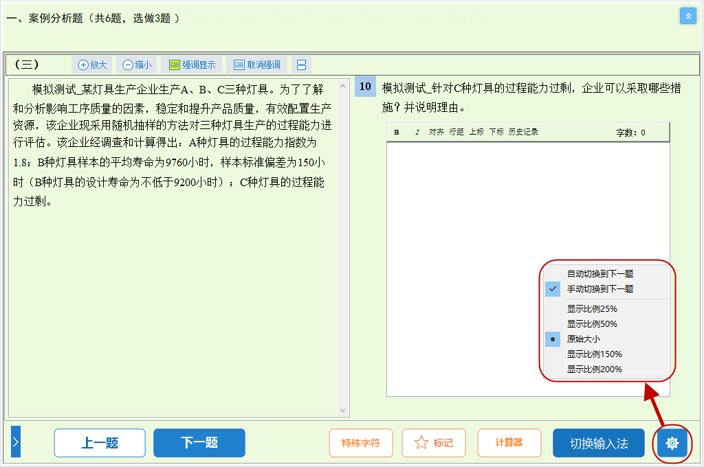 机考系统提供了缩放试卷比例的功能,应试人员可根据需要设置缩放比例。具体操作方法见下图: