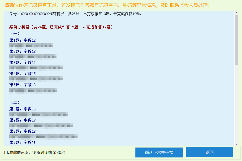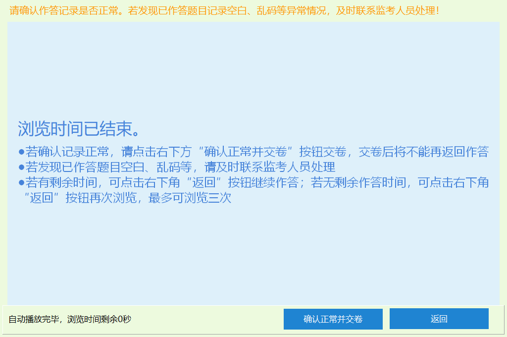 应试人员确认交卷后,系统进入作答确认界面,将在30秒内以图片方式显示作答结果。若记录正常,应试人员应点击“确认正常并交卷”按钮交卷,确认后将不能再返回作答界面,请务必慎重,以免误操作;若希望再次查看作答结果,可点击“返回”按钮(最多可查看3次);若发现作答记录不正常(如出现乱码等),请及时联系监考人员处理!