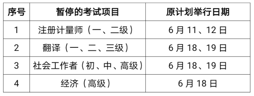 根据新冠肺炎疫情防控工作有关要求,为确保广大应试人员生命安全和身体健康,经研究决定,暂停上海地区原计划于2022年6月举行的注册计量师(一、二级)、翻译(一、二、三级)、社会工作者(初、中、高级)、经济(高级)等4项全国专业技术人员职业资格考试。
