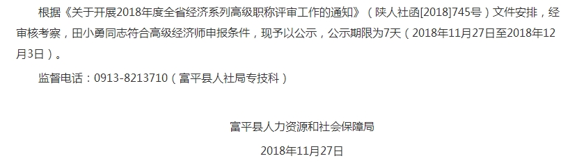 摘要:陕西省富平县2018年副高级经济师申报人员名单已公布,公示期限为2018年11月27日至2018年12月3日。