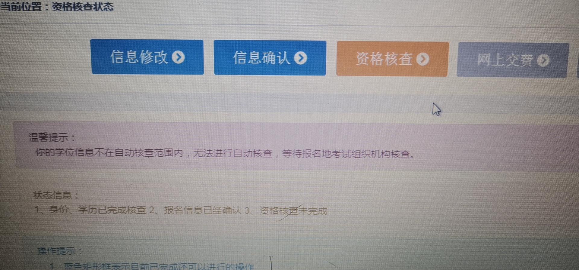 在2021年高级经济师报名过程中,有部分考生遇到了“你的学位信息不在自动核查范围内,无法进行自动核查,等待报名地考试组织机构核查”这样的提示(截图如下),怎么办?如何审核?